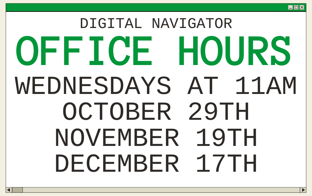 You’ve got tech questions, and Gia, our Digital Navigator, has got tech answers. Drop in for Gia’s office hours on the last Wednesday of each month, make yourself a cup of coffee, and ask away. Gia can help you find a starting point for solving a tech problem, explain the basics of tech buzzwords like AI and The Cloud, walk you through using a new device, and lots more.